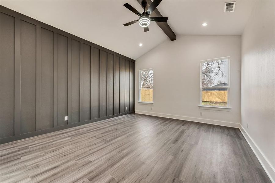 This thoughtfully designed 4-bedroom, 2-bath residence offers a bright, open layout filled with natural light from expansive windows throughout. The main living area features soaring vaulted ceilings with exposed beams, creating architectural character and an airy, modern feel. The primary suite continues that design statement with its own vaulted beamed ceiling, offering a warm yet contemporary retreat.