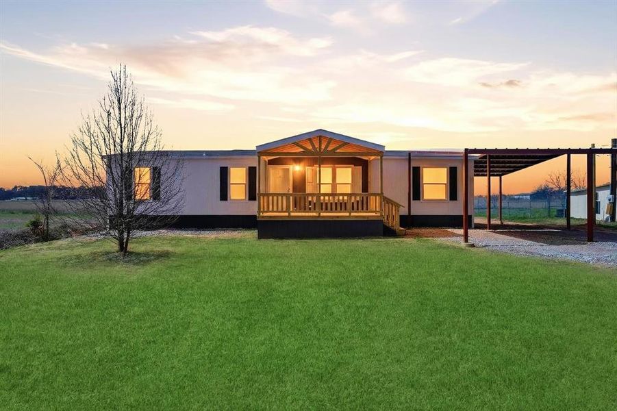 Welcome home to 309 Rhett Ct. in Aurora, TX — where modern comfort meets peaceful country living on a generous 0.36-acre lot with no HOA. This new 2025 home offers 1,568 square feet of inviting, thoughtfully designed living space featuring 4 bedrooms and 2 full bathrooms. Step inside to an open-concept layout filled with natural light, highlighted by a stylish kitchen with a spacious island, sleek modern white cabinetry, and a full appliance package including range, microwave, dishwasher, and refrigerator — ready for everyday living and effortless entertaining. The dining area flows seamlessly to the outdoors through glass sliding doors, leading to the rear porch and creating the perfect indoor-outdoor connection for relaxing evenings or weekend gatherings. The private primary suite serves as a true retreat, complete with a walk-in closet and ensuite bath featuring a walk-in shower. Secondary bedrooms offer flexibility for family, guests, a home office, or hobbies. Enjoy quiet mornings on the 10' x 18' covered front porch and unwind in the evenings on the rear porch overlooking your spacious yard. The property also features a 12' x 40' L-shaped carport, providing ample covered parking and convenience. For added peace of mind, this home includes a 1-year manufacturer warranty — offering confidence in your investment from day one. If you’ve been looking for space and move-in ready convenience without HOA restrictions, this is your opportunity to make it yours before someone else does! Schedule your showing today!