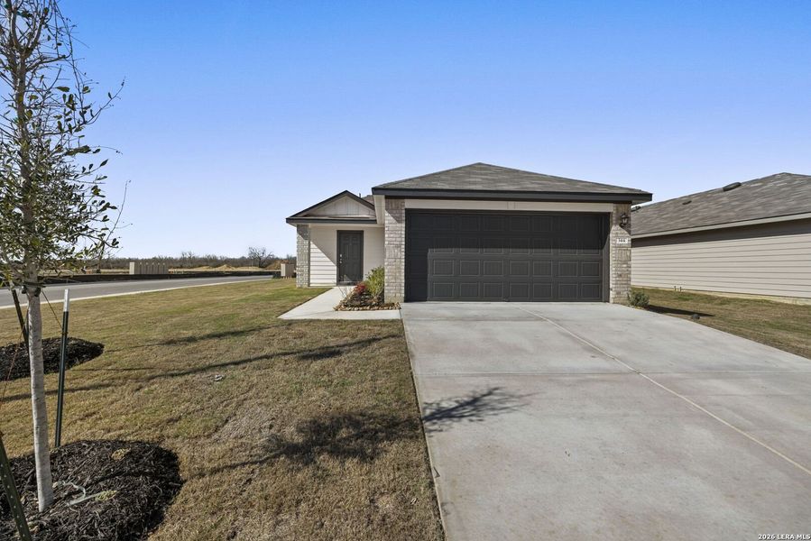 Welcome to the Emma floorplan in Arroyo Ranch in Seguin, Texas - a thoughtfully designed one-story home offering 4 bedrooms, 2 bathrooms, and 1,573 square feet of comfortable living space with a 2-car garage. Step inside from the inviting front porch into a welcoming foyer that opens to a spacious open-concept living area. The kitchen overlooks the dining and family rooms, creating a seamless space for entertaining and everyday living. You'll love the oversized island with stainless-steel sink, quartz countertops, picture-frame cabinets, pantry closet, and stainless-steel appliances. Two secondary bedrooms and a full bathroom are located just off the kitchen, along with a utility room that connects directly to the garage - perfect for a functional mudroom setup. A third secondary bedroom sits off the dining area. All bedrooms include carpet and closets with wood shelving. The secondary bath features a shower/tub combination and a cultured marble vanity with trench sink. Privately situated at the back of the home, the primary suite offers a relaxing retreat with a walk-in shower, cultured marble vanity with trench sink, and a spacious walk-in closet. Discover comfort, style, and smart living at Arroyo Ranch - schedule your tour today. Seller is willing to assist with closing costs or a rate buy-down through preferred lender with an acceptable offer.*