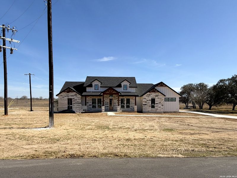 This beautiful modern farmhouse influence 4-bedroom, 3-full baths home with high-end custome home austhetic, 1-acre corner lot in the Villas Las Flores Subdivision, Floresville Texas. The spacious open floor plan living room with high ceilings opens to the the covered patio that create a perfect space for entertaining and country like feeling. The Texas size primary suite also with custom high ceiling with wood beamsand modern oversizes ceiling fan features a full bath with dual vanities, a generously sized double shower, and walk-in-closet. Custom wood cabinetry, granite countertops, large island, and ceramic flooring add style to the kitchen. Three additional bedrooms with unique baths and vanaties offer spacios comfort. Country like living, conveniently close to the City.