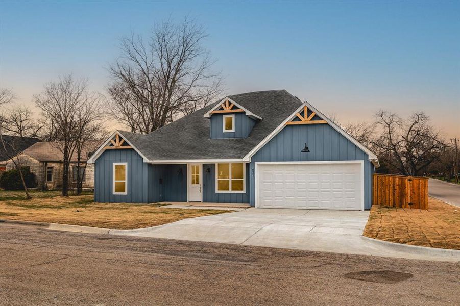 Completed in December 2025, 621 Oaklawn delivers fresh single story living on an expansive 0.20 acre corner lot in River Oaks. A California inspired focus on indoor and outdoor flow shapes the design, beginning with a wide covered back patio that spans the rear of the home and invites everyday lounging and large gatherings. There are three separate access points to this outdoor room from the living area, the primary suite, and a secondary hallway, so traffic moves with ease. A gas connection on the patio is ready for a grill or future fire feature, and the fenced yard is a clean slate for turf, garden beds, or play space. Inside, an open concept great room is centered by a stacked stone gas fireplace, recessed lighting, and durable wide plank flooring with no carpet anywhere. The kitchen pairs timeless shaker cabinetry with quartz countertops on both the oversized island and the perimeter, a mosaic backsplash, stainless appliances including a gas range, a deep undermount sink, and a true walk in pantry for bulk storage. The split floor plan provides privacy with four bedrooms and three full baths. The primary retreat opens to the patio and features a spa style bath with dual quartz vanities, a frameless glass walk in shower, and a generous walk in closet with built ins. Secondary bedrooms are comfortable in scale and are served by two well appointed full baths finished with quartz. Additional highlights include an oversized two car garage, a welcoming front porch, energy efficient windows, and thoughtful storage throughout. Everyday convenience is outstanding with quick access to River Oaks Boulevard for groceries and services, The River District and Trinity Trails for dining and recreation, West 7th and the Cultural District for museums and nightlife, the Historic Stockyards, and Camp Bowie shops. Commuters will appreciate proximity to highways 183, 199, and I 30 as well as major employers including Lockheed Martin and NAS JRB. Welcome home.