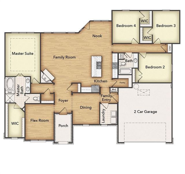 Estimated May 2026 completion! Ask us about our Trade In Trade Up program, we can buy your home! The 4-bedroom Colorado 2 presents a creative yet sensible layout of the home’s 2,417 square feet of living space. Right from the front entrance, you can see the entire main living area. This open concept enhances the spacious feeling and makes it easy to have conversations no matter where you are—perfect for entertaining! The kitchen is a definite eye-catcher in the Colorado 2. We’ve incorporated a massive center island that doubles your counter space and provides comfortable seating for 4 people at the breakfast bar. You can also enjoy the view of the fireplace in the family room. If a formal dining room is on your new home wish list, check that off. Just a few steps from the kitchen, this floor plan has just the room for those special occasions. If formal isn’t your thing, use this as a playroom or a living room. Across the foyer, the Colorado 2 also gives you a flex room to expand on the versatility. With a few small adjustments, you could convert it to a fifth bedroom. The design of the owner's suite is one of the (many) reasons people love this floor plan. The bedroom is nestled in the back of the home under a tray ceiling that accentuates the roominess. The Colorado 2 smartly uses space in the bathroom for both a soaking tub and step-in shower, along with dual vanities and a private water closet. Then your suite is completed with an expansive walk-in closet with wooden shelves and racks ready and waiting for your wardrobe. The 3 secondary bedrooms are clustered in a suite-like space on the other side of the home’s layout. Two of them offer a walk-in closet, while the third one gives just a little bit more floor space. The 3 bedrooms share the home’s second full bath. For a home that creates the ideal balance between togetherness and privacy, the Colorado 2 is fit to be tried!