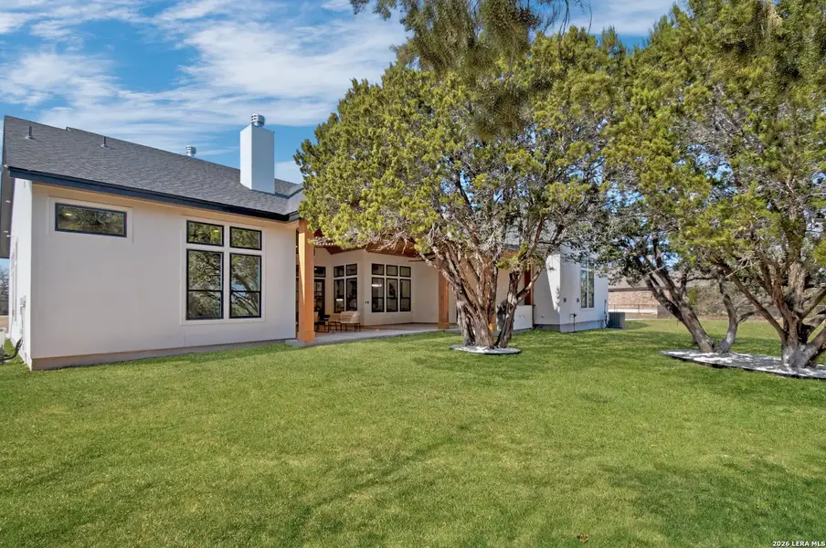 Experience the beauty of Texas Hill Country living in the highly sought-after Bridlegate community in Bandera, TX. This stunning 4-bedroom, 3-bathroom home, plus a convenient powder room near the kitchen, sits on over 2 acres of land, blending luxury with comfort. Inside, you'll be greeted by soaring vaulted ceilings with wood-faux beams that rise over 20 feet, giving the space a bright, airy feel. The living room is centered around a gorgeous stone, wood-burning fireplace that seamlessly extends to the outdoor patio-perfect for cozy nights in or entertaining guests. Step outside to the expansive back patio, which offers over 800 sqft of an outdoor living area and overlooks a private green space. It's the ideal setting for relaxation or hosting gatherings, with an outdoor kitchen ready for barbecues and a built-in sound system for added ambiance. The chef's kitchen is a true standout, featuring a large island with elegant quartz countertops, a gas range with a convenient pot filler, hand-crafted floating shelves, and premium Forno appliances that will convey with the home. This energy-efficient home is designed with foam insulation, stunning Mahogany doors, and beautiful wood flooring throughout. The 9-zone sprinkler system ensures your lawn stays lush year-round, and epoxy flooring in the 3-car garage adds the perfect finishing touches. Don't miss out on this rare opportunity to own a meticulously crafted home in one of Bandera's most desirable communities!