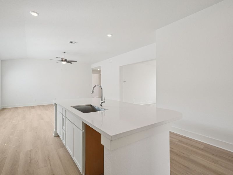 The Rio Grande’s sprawling single-story layout features a bright, open concept living area, dining space, and kitchen. The primary suite boasts a sizeable walk-in closet and dual sinks.