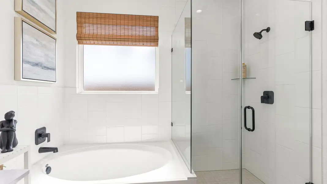 The primary suite is tucked away at the rear of the home for privacy. It features a large walk-in closet and an en-suite bath with dual vanities, a soaking tub, and a separate walk-in shower, creating a luxurious retreat.