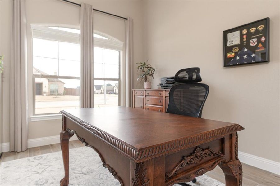 One bedroom is thoughtfully designed as a home office or flex room, complete with glass-paneled double doors and custom built-in bookcases, ideal for remote work, a study, or a library retreat.