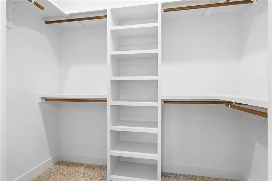 The primary suite continues the vaulted ceilings and light, featuring a fully built-out custom walk-in closet, a large dual-sink white oak vanity, and a walk-in shower with tile to the ceiling, bench seating, and a handheld sprayer.