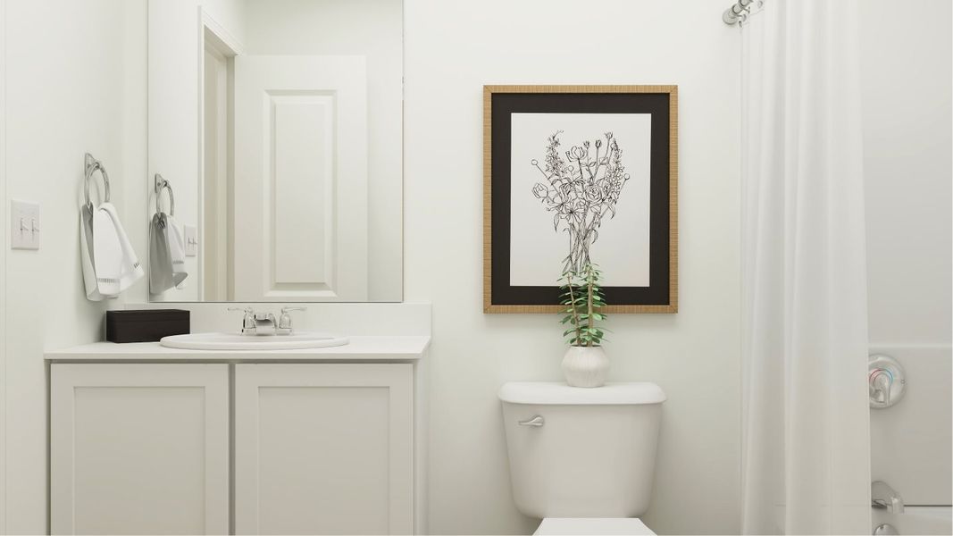 This new two-story home boasts a modern and spacious design. An open-concept floorplan blends the kitchen, living and dining areas on the first floor for seamless entertaining and multitasking. On the second floor, four bedrooms surround a versatile loft, including the lavish owner’s suite with a full-sized bathroom.