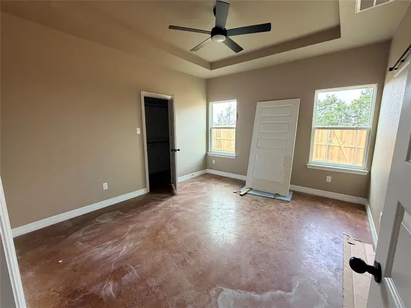 primary suite is thoughtfully designed with a pop-up ceiling, double vanity, large walk-in shower, and spacious walk-in closet.