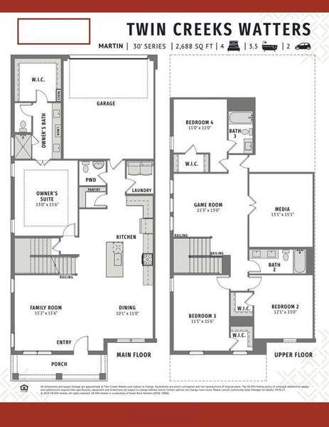 CB JENI HOMES MARTIN floor plan. 2,668 sq ft, 4 bed, 3.5 bath luxury townhome on a CORNER homesite featuring a huge covered front porch—perfect for a dreamy porch swing. This home boasts 10-ft ceilings on the first floor and the owner’s suite downstairs with tray ceiling finish, spacious bedroom, walk-in closet, and spa-like bathroom with oversized shower and dual sinks. Abundant windows flood the home with natural light, ideal for entertaining. Chef’s gourmet kitchen opens to the dining and family rooms and includes a large island, pantry, quartz countertops, site-finished cabinetry with hardware included, under-cabinet lighting, stainless steel appliances, pot and pan drawers, and 5-burner gas cooktop. Upstairs offers three large secondary bedrooms with walk-in closets, including one en suite, a huge game room, and a media room. Located in Twin Creeks Watters, in the heart of exemplary schools, dining, shopping, lakes, parks, and acclaimed golf courses. Enjoy low-maintenance living with modern elegance. Ready JULY-AUGUST 2026!