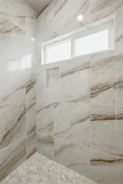 primary suite is thoughtfully designed with a pop-up ceiling, double vanity, large walk-in shower, and spacious walk-in closet.