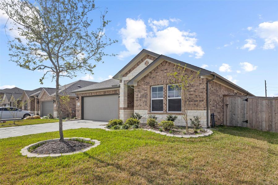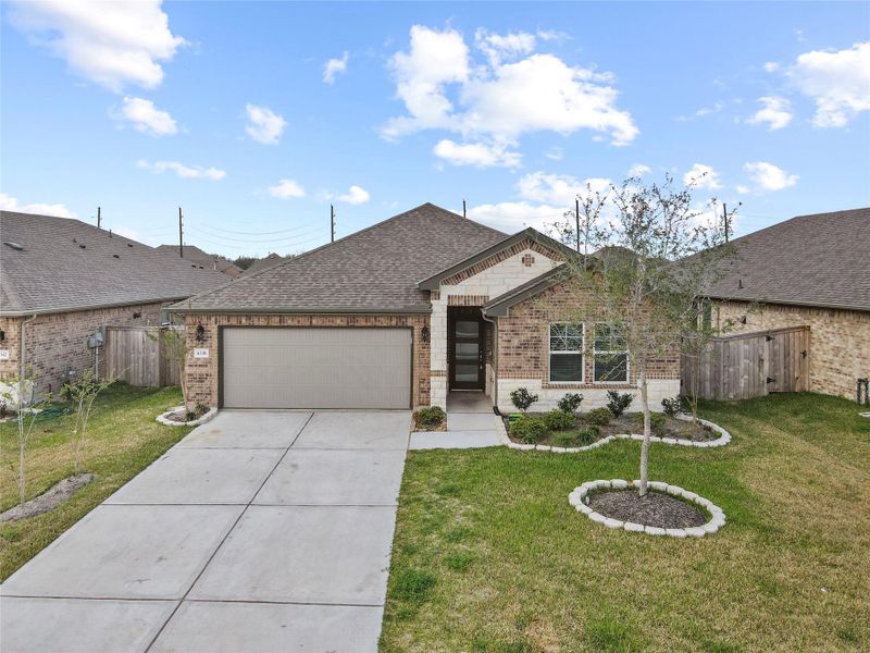 The chef’s kitchen boasts 42" light cabinetry, upgraded backsplash, a huge island, and ample storage, along with stainless steel appliances, including a refrigerator, washer, and dryer. The home also includes a full sprinkler system for added convenience. The primary suite features a luxurious ensuite bath with a walk-in shower, soaking tub, and a spacious dream closet. Additional highlights include LED lighting fixtures and a covered patio, perfect for relaxing or entertaining.