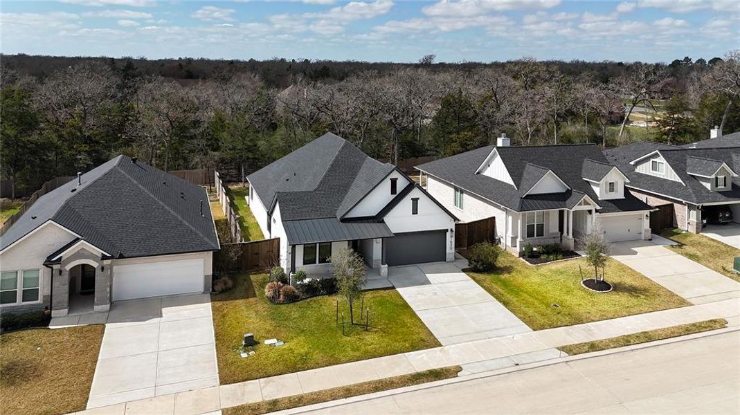 Backing to mature trees and ideally positioned on an interior lot in Mission Ridge, this gorgeous home showcases over $75K in upgrades. RNL custom-built in 2024, this like-new Game-Day home features a striking farmhouse elevation with painted brick, chopped stone & black exterior windows. The extended open-truss, beadboard-ceiling patio offers spectacular views of dense trees through the wrought-iron backyard fence—perfect for relaxing or entertaining. Inside, this 4-bedroom, 3-full bath home features a wide-open plan with engineered hardwood flooring throughout the main living areas and primary bedroom, adding warmth and elegance. The gourmet kitchen is designed for serious cooking and entertaining, featuring a commercial-style range top, upgraded hardware, Blanco sink, large walk-in pantry with space for a beverage-wine refrigerator. Bathrooms include upgraded floor and shower tile, comfort-height Kohler commodes, & upgraded countertops. For privacy & convenience, the kitchen and all bedrooms are equipped with motorized banded shades. The patio & garage both feature slip-resistant concrete epoxy coating for durability and easy maintenance. Security and peace of mind are built in with surrounding security cameras, automated exterior lighting, and a full interior alarm system providing 24-7 protection. The home includes a Moen Flo smart water leak detection system that monitors usage, sends alerts, and can automatically shut off the water supply if a leak is detected.