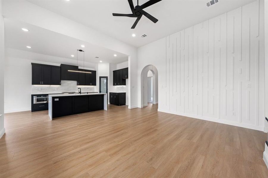 Step inside to an open floor plan filled with natural light and elegant architectural arches that add character throughout the home. The living room showcases soaring 12-foot ceilings and a cozy fireplace, creating the perfect space for relaxing or entertaining.