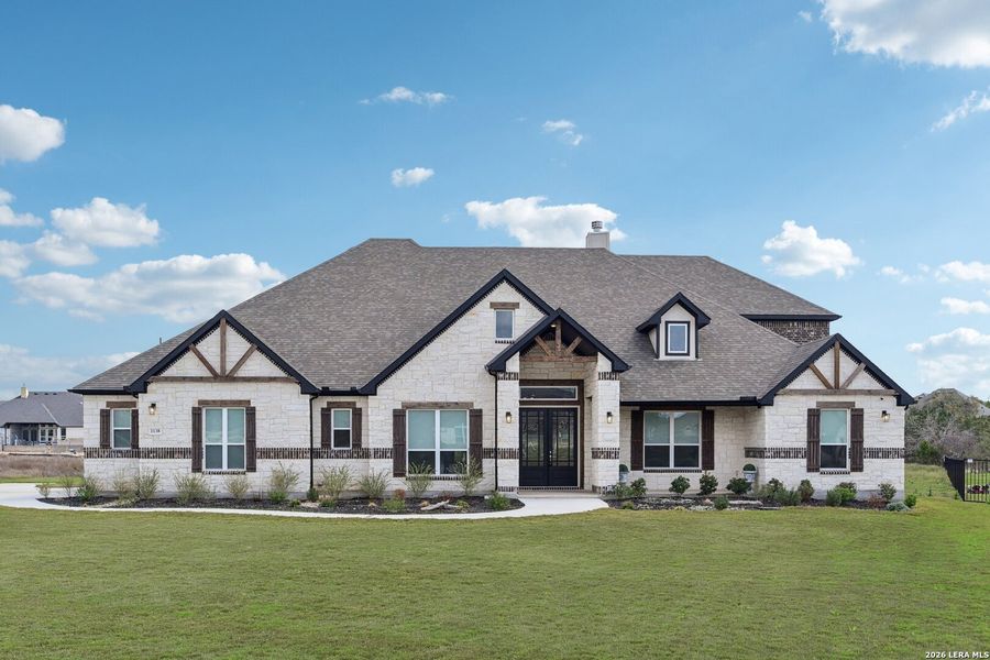 Set on 1.22 acres in the Texas Hill Country, this stunning 2024 home at 1138 Cape May Warbler in New Braunfels offers an exceptional blend of space, design, and elevated living. From the moment you arrive, the impressive stone exterior and expansive front lawn create a striking first impression. Inside, soaring vaulted ceilings with exposed beams, oversized windows, and an open layout immediately capture your attention. Natural light fills the main living space, anchored by a dramatic floor to ceiling fireplace and custom built-ins that make the room feel both grand and inviting. The chef's kitchen is designed for both everyday living and entertaining, featuring a massive island, abundant cabinetry, and premium finishes. Just off the kitchen, a butler's pantry and formal dining room provide the perfect setup for hosting gatherings, while the breakfast area overlooks the property. The primary suite feels like a private retreat, offering generous space and peaceful views of the surrounding acreage. The spa inspired primary bathroom is truly extraordinary, featuring a freestanding soaking tub, oversized walk-through shower, dual vanities, and two massive primary closets. This thoughtfully designed home offers 4,262 sq ft with 4 bedrooms and 4.5 bathrooms, along with a dedicated office, media room, and upstairs game room, creating flexible spaces for work, relaxation, and entertainment. Outdoor living is just as impressive. The covered patio with an outdoor fireplace extends the living space and creates the perfect place to unwind while enjoying quiet Hill Country evenings. Located in the desirable New Braunfels area, you are just minutes from the historic Gruene district, live music at Gruene Hall, Guadalupe River tubing, boutique shopping, and some of the area's best dining and wineries. Luxury, space, and modern design come together in this exceptional Hill Country home.