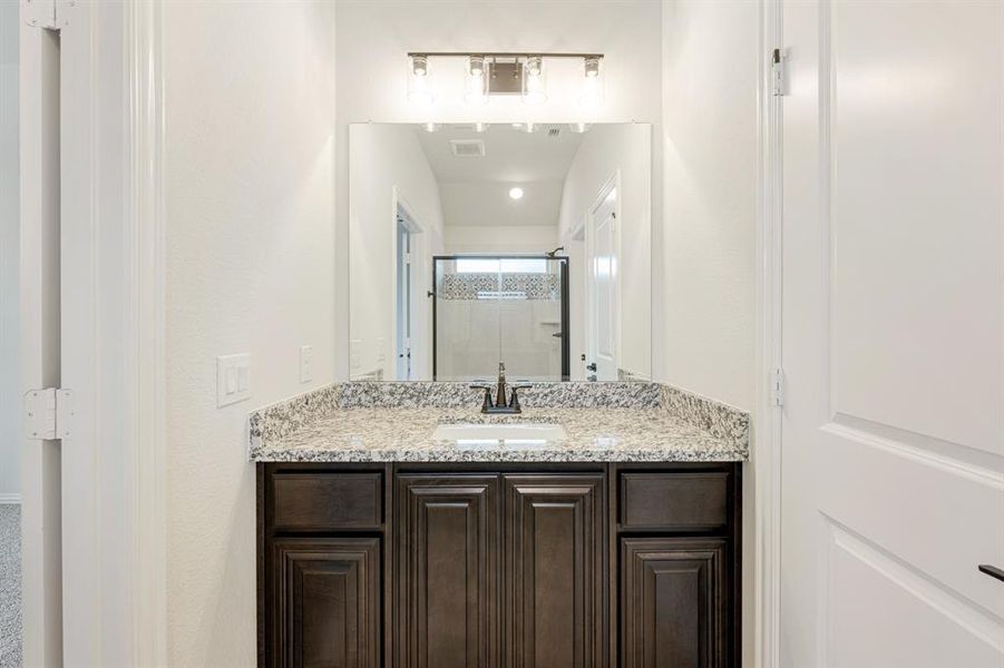 NEW! NEVER LIVED IN. Holly VI prototype from Bloomfield Homes, an exploration into a new, contemporary two-story hosting a breathtaking central family room, 4 bedrooms, 4 full baths, and an entertainment space upstairs (game-media room combo). Includes an In-Law Suite! From the outside, this home showcases timeless architecture made of stone and brick, a full 2-car garage and a large, covered front porch to welcome you. Like a perfectly framed photograph, the wide foyer hallway creates a moody entrance before opening up into an 18'-high family room bordered by an open staircase and going into a huge, island kitchen. In the center, an island with legs and breakfast bar sits below pendant lights on either side of cabinet and work space. Built-in stainless steel appliances come with this design, including a gas cooktop above deep pot and pan drawers! Windows allow natural light to illuminate the home all day long, or take advantage of the 2-inch faux wood blinds when shade or privacy is required. Speaking of privacy, the Primary Suite is the only bedroom downstairs and comes with backyard views from a charming window seat! A full 5-piece bath provides space for everyone with a dual sink vanity, soaking tub, and bench-seat shower. Other conveniences on the first floor include scratch-resistant RevWood floors in common areas, a powder bath and coat closet off the foyer, a mud bench in the laundry room (off garage), and a generous covered rear patio beyond the kitchen! Upstairs, the game room takes center stage - with the media room open for more room to spread out. In-Law Suite is on the opposite side of the layout from the other 2 bedrooms, each with a walk-in closet! Another bathroom is right off the game room for hosting or when sharing isn't an option. Come explore this new prototype - it's crafted with Bloomfield Homes' buyers in mind!