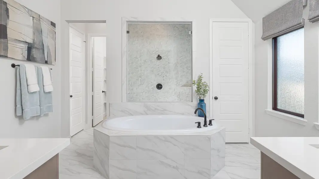 Entry welcomes with 12-foot ceiling. Game room with French doors and 12-foot ceiling off extended entry. Kitchen and dining area open to spacious family room with wall of windows and a wood mantel fireplace. Kitchen hosts inviting island with built-in seating space, 5-burner gas cooktop, and two wall ovens. Hardwood floors throughout main living area. Primary suite includes bedroom with 12-foot ceiling. Double doors lead to primary bath with dual vanities, a freestanding tub, separate glass-enclosed shower and two walk-in closets. Abundant closet space and natural light throughout. Extended covered backyard patio. Mud room off three-car garage.