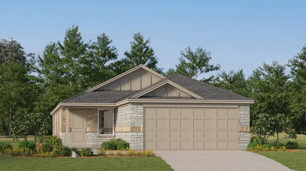 This new home offers simple living with a convenient single-level layout. An open-concept floorplan combines the kitchen, living and dining areas for simple entertaining and multitasking. Three secondary bedrooms are tucked away to the side of the home, and the owner’s suite is nestled into a private rear corner, offering access to a spa-inspired bathroom and walk-in closet.