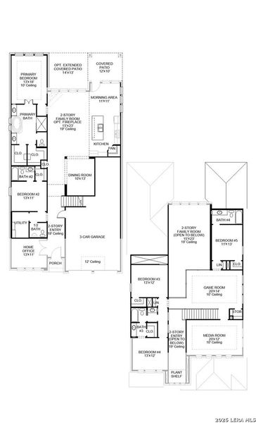 Home office with double doors framing the entry. The two-story entry extends past the dining room to the kitchen and family room. Island kitchen offers built-in seating space a 5-burner gas cooktop, and a corner walk-in pantry. Formal dining room. Two-story family room with 19-foot ceiling and a wall of windows. Morning area just off the kitchen offers a beautiful view of the backyard. Primary suite with three large windows. Primary bathroom features a French door entry, dual vanities, freestanding tub, separate glass enclosed shower and two walk-in closets. Guest suite with a full bathroom and a walk-in closet on first level. Second floor hosts a large game room, media room, an additional guest suite and secondary bedrooms with a Hollywood bathroom. Additional storage space, half bathroom, linen closet and a utility room completes this generous design. Extended covered backyard patio. 6 zone sprinkler system. Three-car garage.