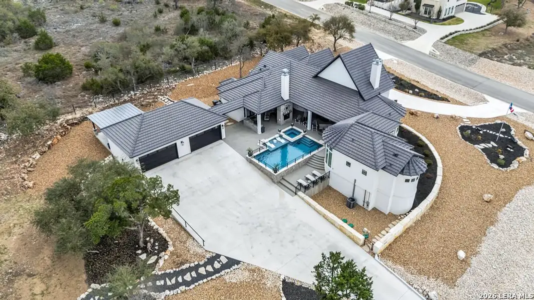 Presenting 5920 Verden Ridge- a scenic hilltop setting with sweeping views of the Texas Hill Country, and breathtaking west-facing sunset views. This exceptional estate delivers luxury living with a design centered around light, space, and effortless entertaining. Thoughtfully crafted with 4 bedrooms, 4 full bathrooms, and 2 half baths, the home offers both grand gathering spaces and private retreats. From the moment you enter, soaring ceilings and expansive windows frame the surrounding landscape while filling the home with abundant natural light. Light-toned walls and an open, airy layout create a refined yet welcoming atmosphere throughout. The kitchen features kitchen aid appliances throughout and a Zline range offering gas and electric cooking options. Multiple glass doors along the back of the home seamlessly connect the interior living spaces to the outdoor retreat, allowing the stunning views to remain the focal point. Designed for both relaxation and entertaining, the outdoor living area features an inviting inground pool and generous entertaining spaces, ideal for hosting guests or enjoying quiet evenings overlooking the rolling Hill Country. The property features an impressive four-car garage with rear entrance and slab, ample storage space, and a layout that perfectly blends luxury, comfort, and connection to the surrounding landscape. The home has a whole house generator, bluetooth sound speakers inside and outside, a primary bathroom steam shower, a Pentair setup hot tub and heated pool, and front irrigation in garden beds. This is a rare opportunity to own a hilltop sanctuary, where elevated design meets breathtaking Texas Hill Country views!