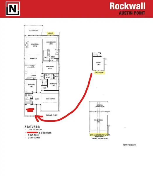 The Rockwall floor plan in the Portrait Series features 2,300 sqft, 3 bedrooms, 3 bathrooms, and a 2-car garage. This one-story floor plan offers study options, covered patio option, enlarged main shower option, 4 and 5 bedroom options, and 3rd bay option