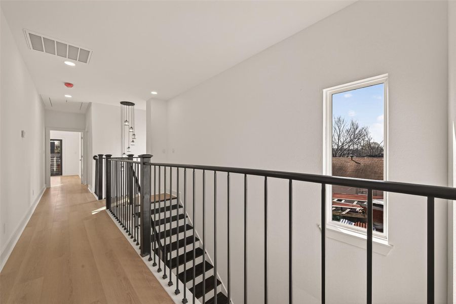 The bright, open-concept living area showcases a contemporary kitchen with quartz countertops, shaker cabinets, and modern fixtures, creating a warm and inviting atmosphere. Enjoy no carpet throughout, water-resistant luxury vinyl plank flooring, and 8-foot doors throughout the home, enhancing the sense of space and architectural elegance. Double-pane low-E windows filling the home with natural light.
