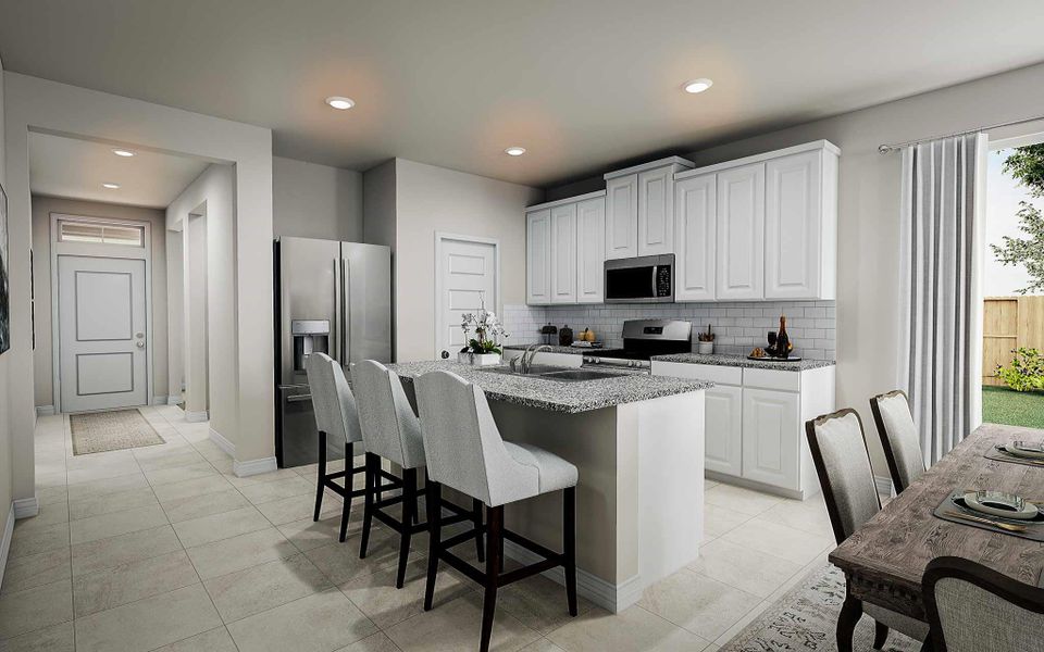 The Daisy floorplan - This amazing two-story plan features an open-concept layout that flows seamlessly from the spacious foyer into the great room, home office, casual dining area, and gourmet kitchen. The kitchen boasts a GE 30" Free-Standing Gas Range, Groveland Poplar Grey Wolf cabinetry, Everest Mist granite countertops, and Mythology Santorini Picket Mosaic tile backsplash. Retreat to the primary suite, which includes a dual sink vanity and walk-in closet. Additional highlights include a covered patio, a convenient laundry room, and a 2-bay garage