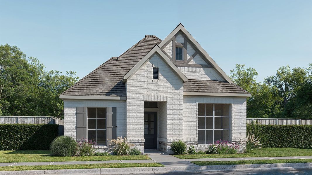 Welcoming porch opens into the entryway with a private home office enclosed by French doors. Across the hall are the secondary bedrooms featuring walk-in closets and a shared bathroom. The open family room is embraced by a wall of windows. The dining area has ample natural light and offers access to a covered side-yard patio. The kitchen hosts an island with built-in seating, a 5-burner gas cooktop, and a corner walk-in pantry. The primary bedroom is at the back of the home and has three large windows. French doors open into the primary bathroom which has dual vanities, a linen closet, a glass enclosed shower, and a large walk-in closet. The mud room and utility room are at the rear of the home for convenience and lead to the two-car garage.