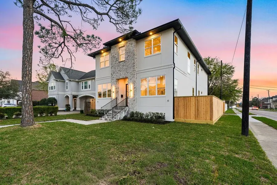 This premier 4/5 bedroom new construction home in Bellaire’s Southdale subdivision is a modern masterpiece blending high-end design with functional luxury. The striking curb appeal features clean rustic brick accent with crisp white stucco, while the interior offers European White Oak floors and expansive windows that bathe the open floor plan in natural light. Downstairs study/bedroom offers flexibility with direct access to the elegant powder bath and a spacious walk-in shower. Elevated by designer lighting, the home showcases sculptural "raindrop" chandeliers and elegant halo pendants throughout. Exquisite stone surfaces range from high-vein marble in spa-inspired baths to a dramatic backlit onyx-style wall in the family room. Culinary enthusiasts will love the top-of-the-line Wolf and Sub-Zero appliance suite. Walking distance to the Nature Discovery Center, parks, and Horn Elementary, this home offers an outstanding location in addition to its exceptional design and workmanship.