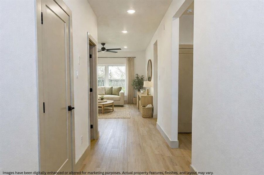 Step inside to an inviting open-concept layout featuring custom-built cabinetry, elegant Calacatta Ajax quartz countertops, and a spacious kitchen perfect for entertaining. The kitchen is highlighted by a 33-inch farmhouse sink, stylish pendant lighting, an air fry range, and beautiful under and over cabinet lighting that creates a warm, modern ambiance.