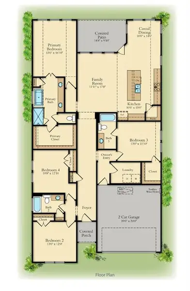 RISLAND HOMES 4102 floor plan. Step into comfort and style with this May move-in-ready 4-bedroom, 3 bath home located on a generous 60' corner homesite in the sought-after Wildflower Ranch community. The thoughtfully designed open concept floor plan offers a family room that flows effortlessly into the stylish kitchen featuring an oversized island, walk-in pantry, and abundant cabinetry. The private primary suite is tucked at the back of the home and features a spa-like bath and a generous walk-in closet. A secondary bedroom with its own en-suite bath creates the perfect space for guests or multi-generational living. Enjoy the covered patio overlooking the backyard, along with added conveniences such as a large laundry room, ample storage, and a 2-car garage. Ideally located within walking distance to the community amenity center, pool, and convenience store, this home also offers access to fantastic neighborhood amenities including a lazy river, dog park, playgrounds, and more. Don’t miss the opportunity to make this beautiful home yours, call the sales manager today to learn more about available incentives and schedule your private tour.