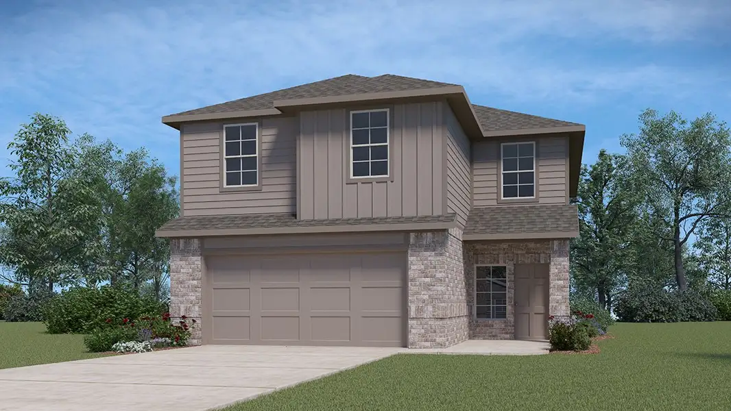 Welcome to The Kate floor plan, a two-story home located in Hunters Ranch in San Antonio, TX. This home features 2 classic front exteriors, 4 bedrooms, 2.5 baths, a spacious 2-car garage and 2223 square feet of living space.