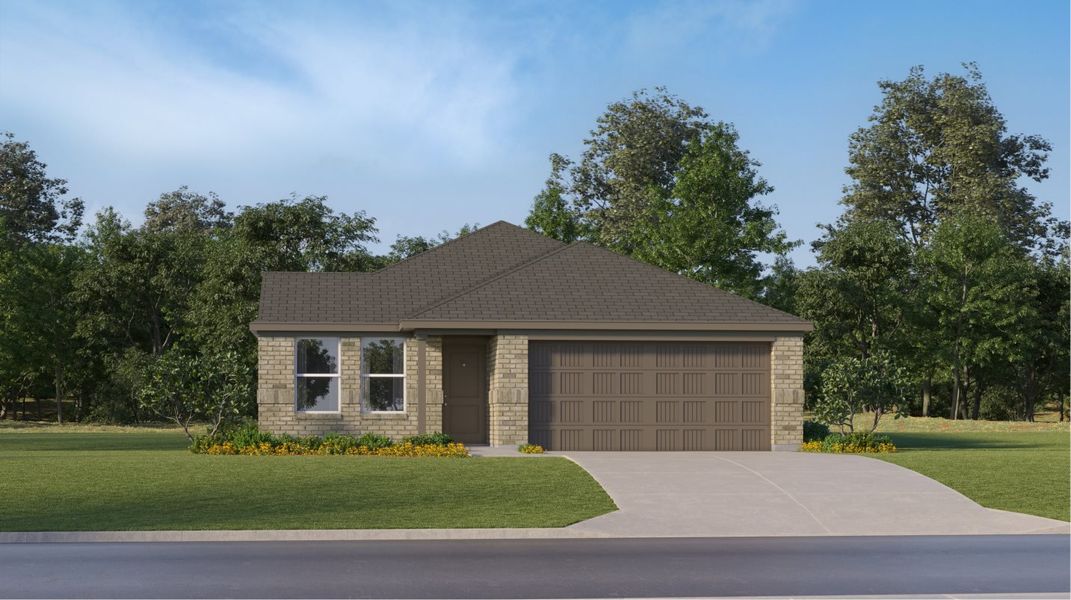 Designed for convenient and modern living, this new single-story home features a breezy and open layout. The foyer leads to a peninsula-style kitchen overlooking the dining area and family room, with a rear door extending to the backyard. Throughout the home are two secondary bedrooms and a tranquil owner’s suite with an en-suite bathroom and a walk-in closet. A versatile two-car garage completes this floorplan.