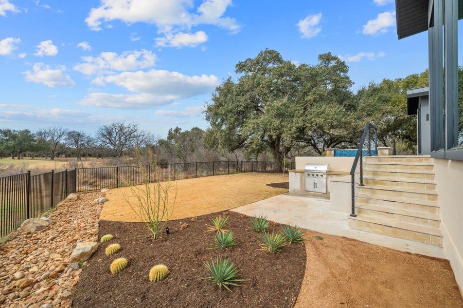 Welcome to 111 Orange Plume in the coveted Summit Rock community of Horseshoe Bay—where contemporary architecture and breathtaking golf course views converge in extraordinary fashion. This newly constructed residence captures sweeping southeastern vistas of the 14th green of the Summit Rock Golf Course, creating a serene and ever-changing backdrop. Designed to blur the line between indoor and outdoor living, the first floor is framed by expansive full glass walls that flood the home with natural light and invite the outdoors in. The result is an open, airy atmosphere that fully embraces the beauty of the surrounding landscape while maintaining refined sophistication. The thoughtfully crafted floor plan offers four spacious bedrooms, including two luxurious primary suites—one on each level—perfect for multigenerational living or hosting guests with privacy and ease. A dedicated study downstairs provides a quiet, polished workspace, while the upstairs game room offers an ideal setting for entertainment and relaxation. Dual laundry rooms—one on each floor—add a layer of everyday convenience rarely found. The three-car garage features sleek epoxy flooring and abundant storage. Outdoors, a sparkling pool and hot tub overlook the course, complemented by a fully equipped outdoor kitchen—creating the ultimate setting for effortless entertaining, sunset dinners, and weekend gatherings. Inside, designer finishes, and high-end Miele appliances elevate every space with intentional elegance.