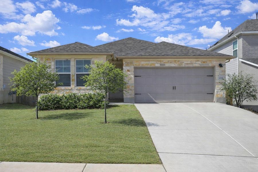 Welcome to 12206 Purple Prairie Ln, where comfort meets versatility in this thoughtfully designed single-story home! With 4 beds, 3 full baths, an open-concept layout, and a versatile flex space, this home is perfectly tailored to adapt to your lifestyle. From its warm, neutral tones to its beautifully low-maintenance LVP flooring that flows through the common areas, every detail is curated to create a welcoming space filled with natural light. The kitchen is the heart of the home, and this one truly shines. Rich espresso cabinetry adds a touch of elegance that anchors the homes bright design, while the chic tile backsplash and quartz countertops bring a modern touch. The layout is as practical as it is inviting. At the front of the home, a private guest suite with its own ensuite bath is ideal for multigenerational living, hosting visitors, or giving a teen their own haven. Meanwhile, the primary suite is tucked at the rear for maximum privacy—it’s a true retreat complete with a windowed nook for a cozy seating area and an ensuite bath with dual vanities and an oversized walk-in shower. At the center of the home, flanked by two additional secondary bedrooms, lies a bonus space that’s a blank canvas for your imagination. Whether you dream of a cozy den, a vibrant playroom, a yoga studio, a craft room, a quaint library/reading room, or a productive home office, this flex space can transform to meet your needs and quickly turn a house into a home.