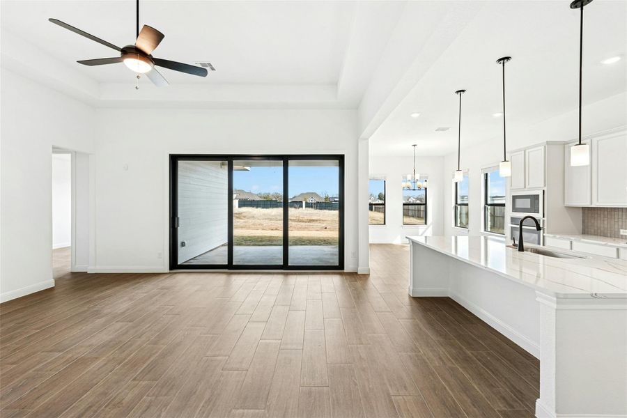 Step into the heart of the home where 10-foot black sliding doors in the family room bring in tons of natural light and open to the covered patio, making indoor-outdoor living feel effortless. You’ll love the elevated finishes throughout, including tile plank flooring in all main living areas, 12-foot coffered ceilings, and custom touches at every turn.