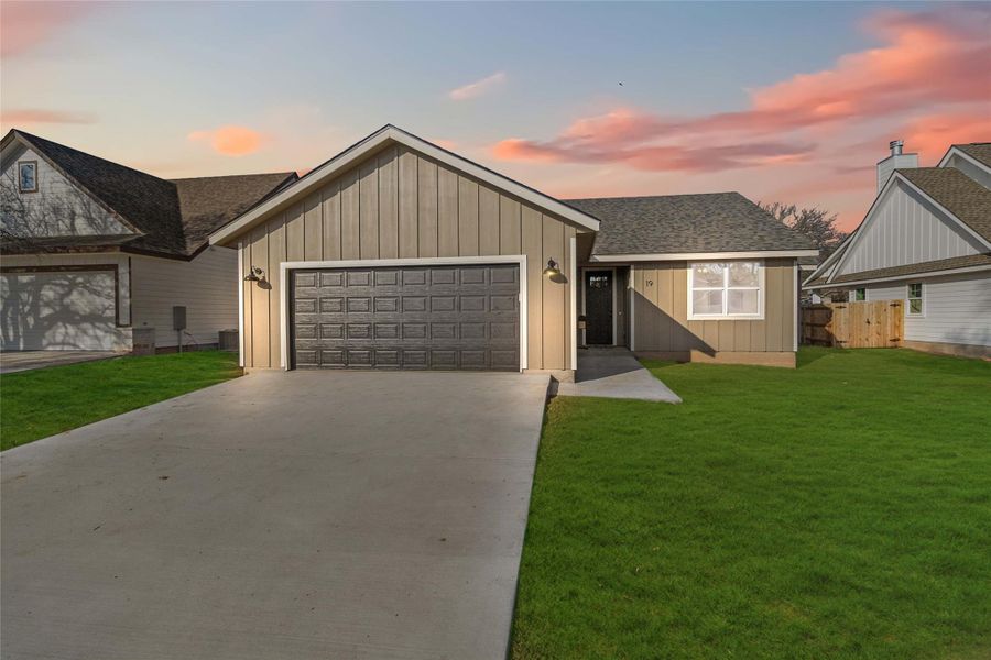 The covered back patio overlooks a spacious backyard, offering room to relax and enjoy the peaceful surroundings. The board-and-batten exterior and soft, natural color palette create a cohesive design that feels warm and earthy from the inside out.