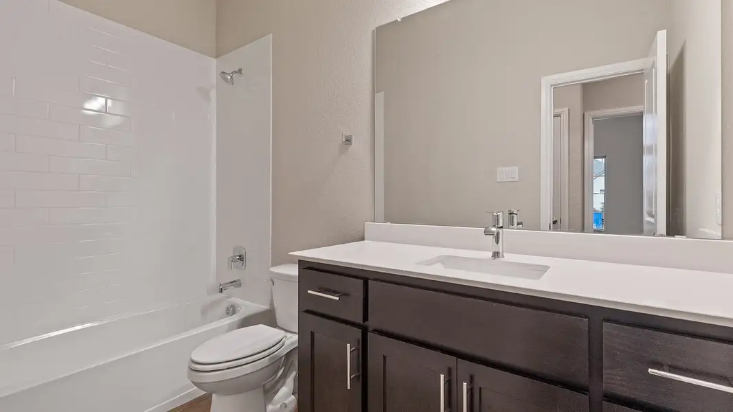 The Odessa is a single-story home offering approximately 1896 sq. ft. of living space across 4 bedrooms and 2 bathrooms. A welcoming foyer leads into an open-concept layout that connects the modern kitchen, dining area, and spacious family room. The kitchen includes stainless steel appliances, quartz countertops, a center island, and a walk-in pantry, creating a stylish and functional space for everyday meals and entertaining. The private primary suite features a generously sized bedroom, an en-suite bath with a large walk-in shower and dual quartz vanity, and a walk-in closet. Three secondary bedrooms and a full bathroom are thoughtfully positioned in their own wing of the home. A dedicated laundry room and attached 2-car garage add everyday convenience, making the Odessa a comfortable and practical floorplan for a variety of lifestyles.