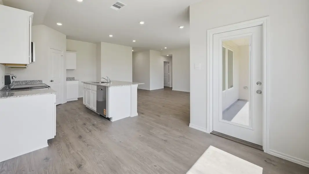 Opening the door will lead you to a foyer entry that invites you to the rest of the home. The kitchen features 30” cabinets with hidden hinges, granite or quartz countertops, and stainless-steel appliances. The kitchen layout includes a built-in sink, dishwasher and large pantry for plenty of storage space.