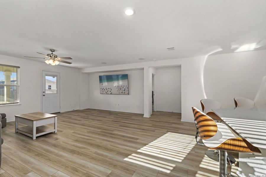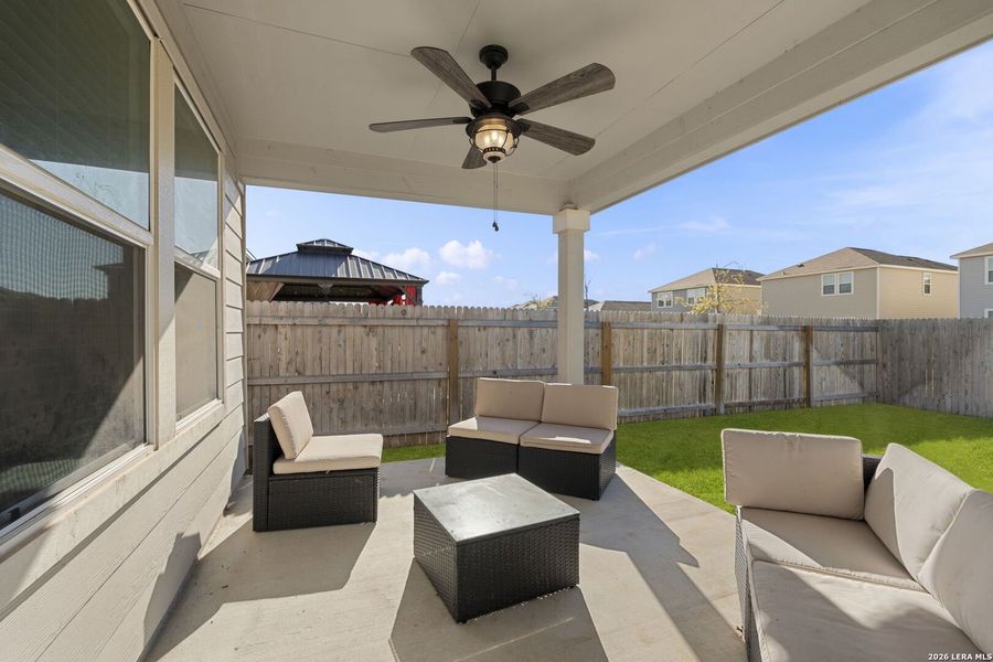 Welcome to this stunning, better than new move-in ready home, where modern design meets functional luxury. Loaded with upgrades that you will not get buying new which include blinds, ceiling fans, large oversize covered patio, premium oversized taller cabinets, washer / dryer , upgraded landscaping package and more. This meticulously crafted single-story residence offers an open-concept layout designed for both comfortable daily living and seamless entertaining. Step inside to find a completely carpet-free interior, featuring durable and stylish flooring throughout for a sleek, low-maintenance lifestyle. The heart of the home boasts a premium chef's kitchen, fully equipped with upgraded stainless steel appliances and elegant, oversized cabinetry that provides ample storage and a high-end aesthetic. High ceilings and large windows flood the living spaces with natural light, creating an airy and inviting atmosphere. Transition effortlessly to the outdoors via the expansive back patio. Whether you're hosting a summer BBQ or enjoying a quiet morning coffee, this space is built for relaxation. Situated on a generous size LOT , there is plenty of room for gardening, play, or future custom landscaping projects. Located in the highly sought-after Preserve at Culebra, residents enjoy a peaceful neighborhood feel with convenient access to local shopping, dining, and top-rated schools.