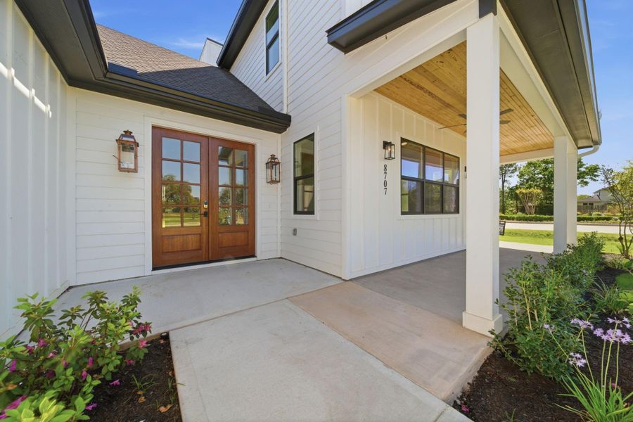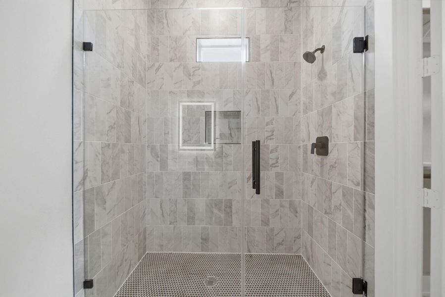 The kitchen is built for entertaining with a quartz waterfall island, gas range, and hidden butler’s pantry. The primary suite offers a spa-like bath with soaking tub, oversized shower, dual vanities, and floor-to-ceiling tile.