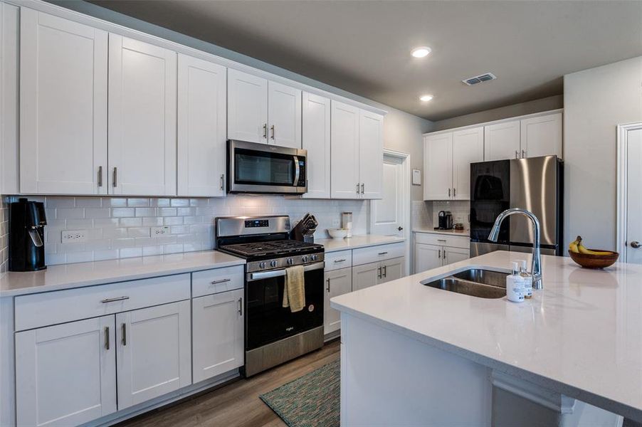 Step into a home where comfort, space, and versatility come together effortlessly. This four-bedroom, three-bathroom residence is thoughtfully designed for everyday living. The primary suite is located on the first floor, offering a peaceful, private retreat away from the additional bedrooms upstairs. The open-concept layout seamlessly connects the living, dining, and kitchen areas, creating the perfect setting for everything from holiday gatherings to relaxed weeknight dinners. At the center of it all is the kitchen—featuring an oversized island ideal for morning coffee, homework time, or casual entertaining. Quartz countertops, ample cabinetry, and generous prep space make cooking and hosting both easy and enjoyable.