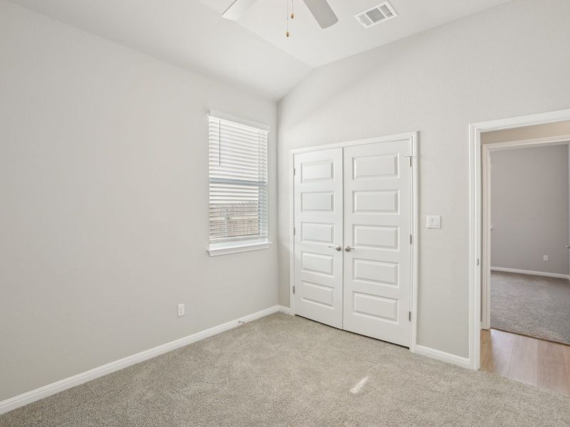 Clear views between the family room and kitchen make this home feel extra spacious. Almond cabinets with marble-look white quartz countertops, cool beige laminate flooring, and multi-tone taupe carpet in our Essence package.