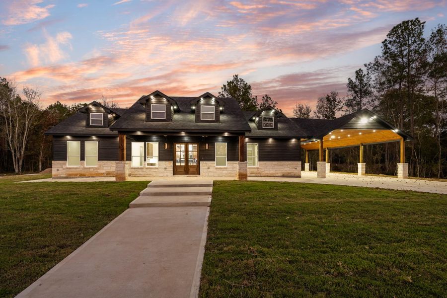 Stunning custom 4 bedroom 4.5 bathroom home situated on 7.5 unrestricted acres. Come home to peace and privacy, only minutes from Cleveland and Highway 59. This home has all the upgrades and space you are looking for! Entertainers dream with an outdoor kitchen and front pergola with firepit overlooking your private pond. Designer lighting inside and out. Kitchen is a chef's dream featuring floor to ceiling cabinetry, gas range, pot filler, hidden walk in pantry (next to stove), enormous quartz island and farmhouse sink. Primary suite offers a luxurious oversized walk in shower with three shower heads and soaking tub for a spa like experience. All bedrooms have their own designated bathroom, hallway between secondary rooms lined with more cabinetry. There is so much storage space in this home! Laundry room includes a sink. No expense has been spared! Additional room could be utilized as another primary suite or a massive gameroom. Low tax rate, no flooding! One of a kind property!
