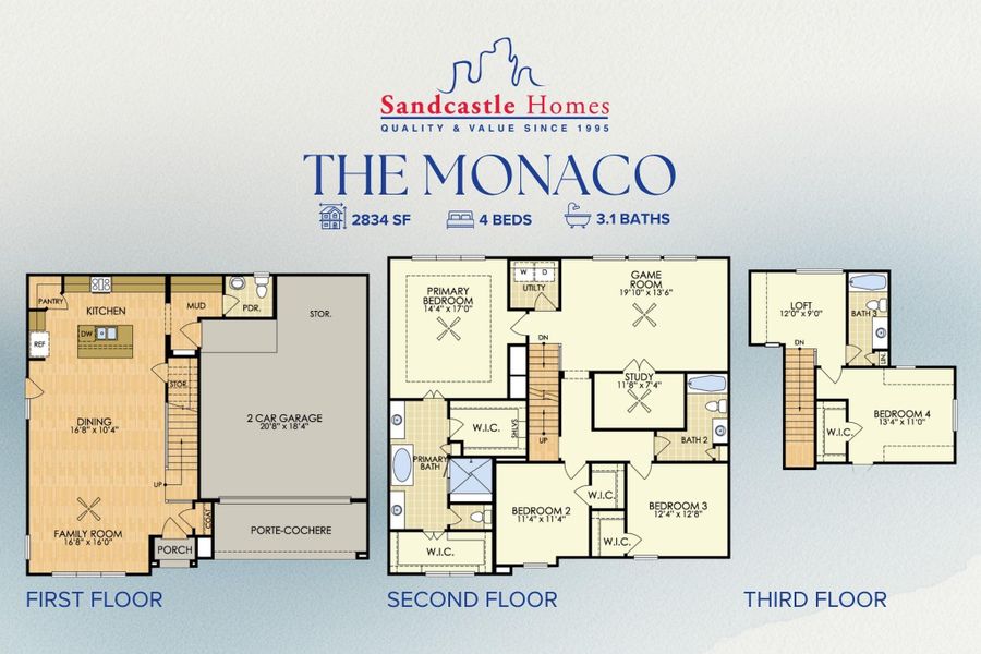 First-floor living, thoughtful flexibility, and everyday ease come together beautifully in The Monaco by Sandcastle Homes. The open kitchen, dining, and family room create a warm, connected space for quiet nights in or easy entertaining, while the fenced yard with cedar privacy fencing extends the living area outdoors for pets, play, or relaxed evenings outside. A walk-in pantry, true mudroom, oversized garage, and private driveway for two cars add the kind of function that makes daily life simpler. Upstairs, a game room, dedicated study, and spacious primary suite with two walk-in closets offer room to work, unwind, and recharge. The third-floor loft adds valuable flex space alongside a fourth bedroom and full bath, ideal for guests, a media room, or a second office. Set on a prominent corner, this home also enjoys beautiful natural light and standout curb appeal.