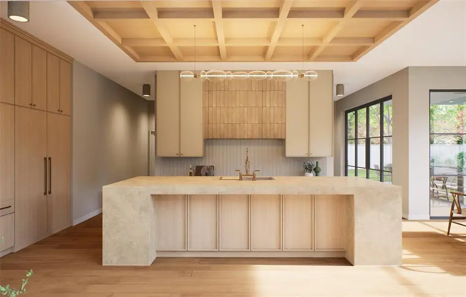 The kitchen is both sculptural and functional, anchored by a statement stone island and supported by a butler’s pantry and separate back kitchen for seamless entertaining. The open living areas flow effortlessly to the covered patio and backyard, designed for year-round enjoyment.