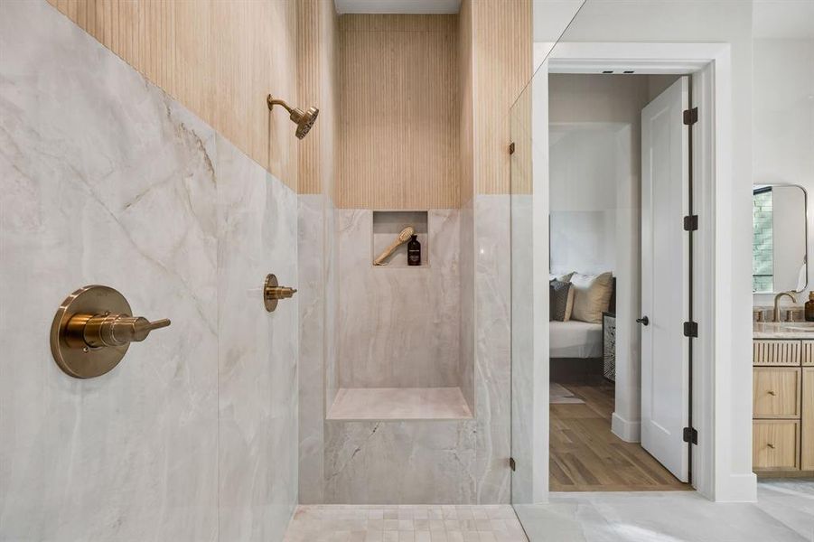 The primary suite offers a private retreat with vaulted ceilings, abundant natural light, and a dedicated sitting area. The spa-like en suite bath includes heated floors, a soaking tub, expansive walk-in shower, and a spacious custom walk-in closet.