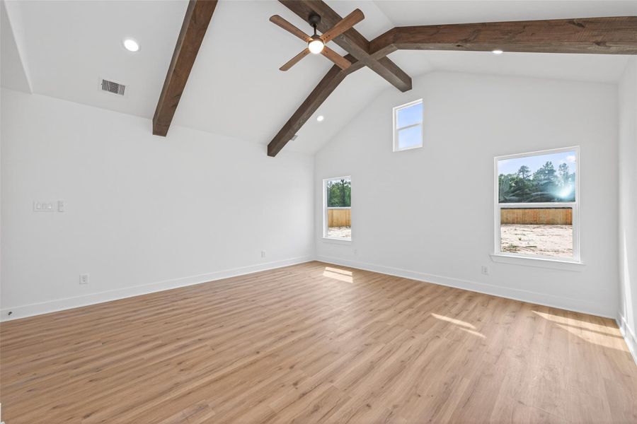 The primary suite is a true retreat, featuring an oversized bedroom with vaulted ceilings and stunning wood beams, along with a spa-inspired bathroom complete with a double-sink vanity, relaxing soaking tub, walk-in shower, and elegant finishes. The secondary bathroom also showcases modern, upscale finishes. Step outside to enjoy the oversized covered back patio with wood-accented ceilings and LED lighting. Situated on a generous 14,000 sq. ft. lot, this property also offers a long driveway with ample parking, no HOA, a low tax rate, and is not located in a flood zone.