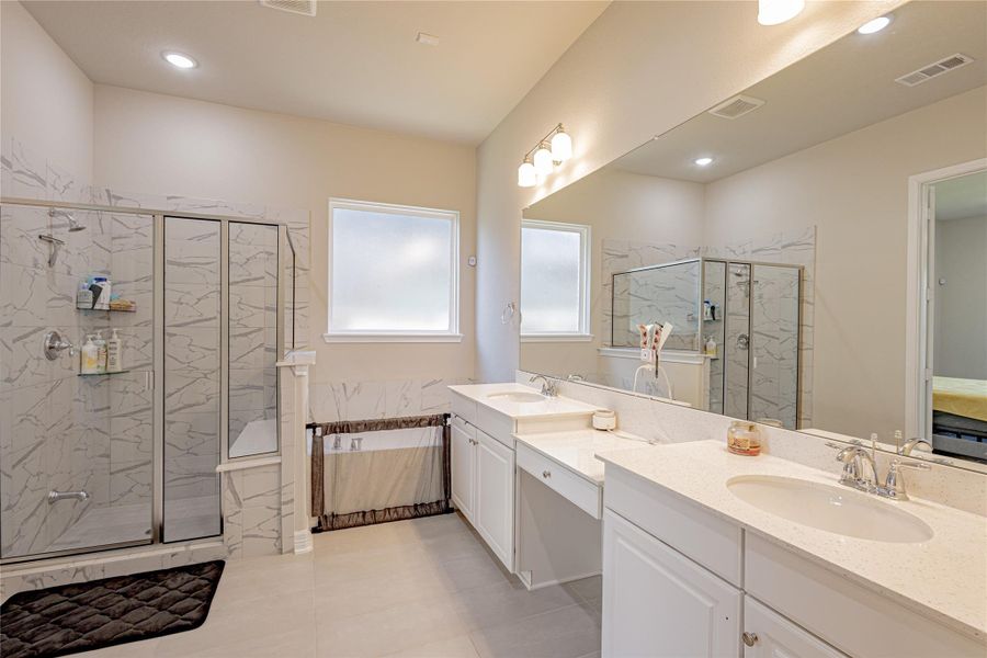 Beautiful like-new home in Stonecreek with a desirable layout featuring 2 bedrooms downstairs, including a secondary bedroom with standing shower ideal for guests or multi-generational living. Grand double-door entry opens to a dramatic 2-story family room with soaring ceilings. Oversized primary suite offers a large walk-in closet. Well-appointed kitchen with abundant cabinet space plus private study. Luxury vinyl flooring on first floor, carpet in bedrooms. Elegant curved staircase leads to spacious game room and 2 bedrooms with shared bath upstairs. Enjoy a large covered patio, charming front porch, and stunning stone & brick elevation, all in a prime location.
