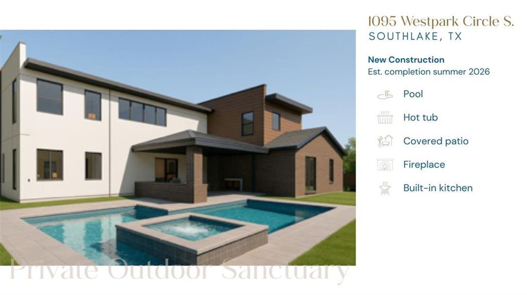 An exceptional opportunity to secure a bespoke modern luxury estate by Ground Up Homes, ideally positioned on a .25-acre corner homesite at T.W. King and Westpark Circle South in Southlake. Currently in the permitting phase with estimated completion in Summer 2026, this architecturally striking residence offers a rare opportunity for the buyer to personalize interior materials and finishes prior to completion while preserving the integrity of the approved elevation and floorplan. Spanning 4,668 square feet, this modern showpiece is defined by clean architectural lines and thoughtfully curated living spaces. It's elevated entertainment and simultaneously cozy. The open-concept main level is anchored by a dramatic two-story great room that connects the living, dining, and kitchen areas, complemented by a dedicated bar and wine room for the refined host. A fully appointed prep kitchen enhances functionality and adds storage.